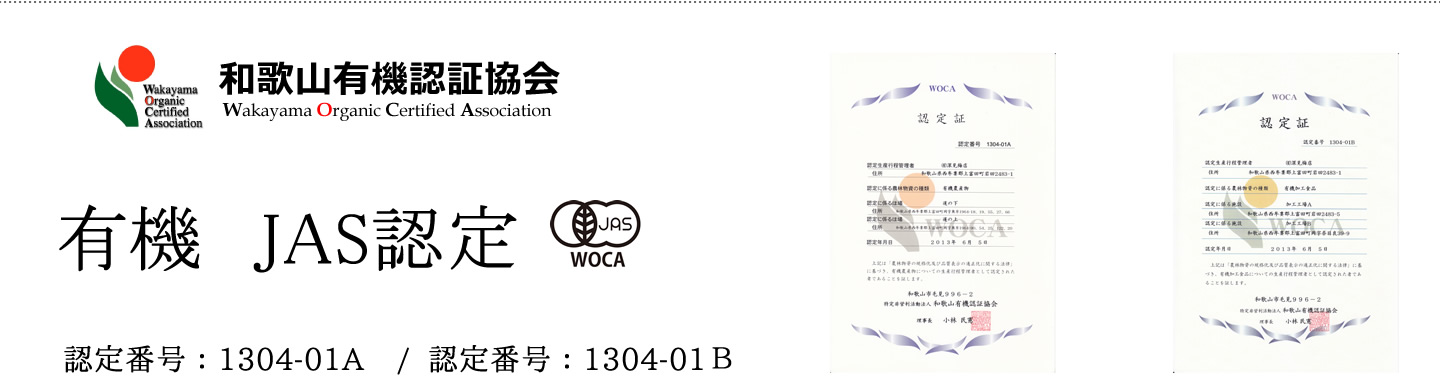 和歌山有機認証協会 WOCAより有機JAS認証をうけております。
