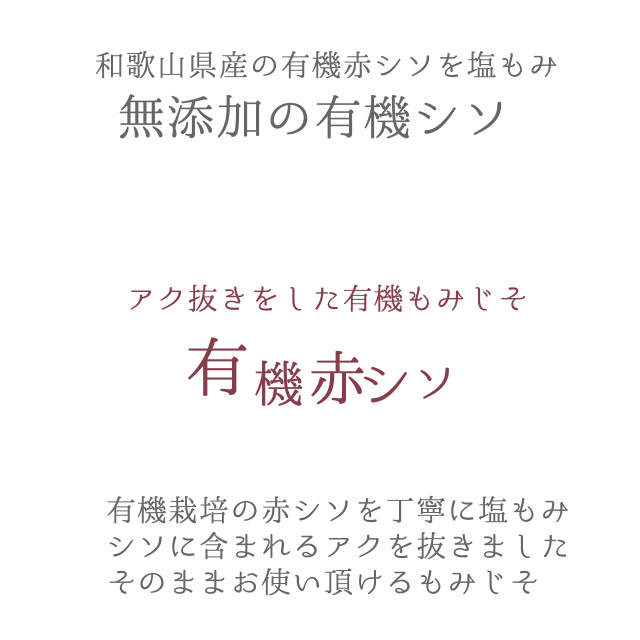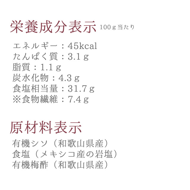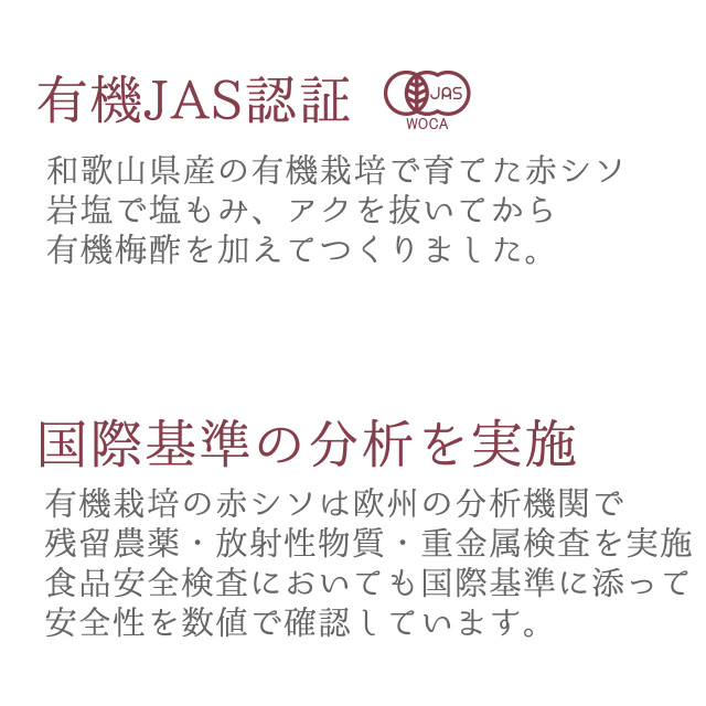 | 原材料名 | 有機赤シソ、食塩、有機梅酢 |